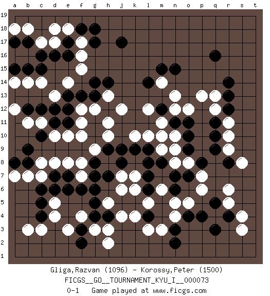 Last move : 0-1 2018 June 1 7:11:19 [Event "FICGS__GO__TOURNAMENT_KYU_I__000073"] [Site "FICGS"] [Date "2018.01.26"] [Round "1"] [Black "Gliga,Razvan"] [White "Korossy,Peter"] [Result "0-1"] [Rating 1 "1096"] [Rating 2 "1500"] 1.q16 d4 2.q3 r5 3.d16 f17 4.e17 f16 5.j17 c14 6.c15 c17 7.c16 e18 8.b17 d17 9.e16 b18 10.a17 a18 11.b15 b14 12.a15 e14 13.f18 d18 14.g17 f15 15.g18 a14 16.d12 d13 17.c6 c8 18.c10 d8 19.c4 c3 20.c5 b3 21.b8 b7 22.a8 a7 23.b9 c7 24.e6 b11 25.b12 a12 26.c12 e10 27.e11 c11 28.d11 d10 29.f13 f4 30.g6 f7 31.f6 j4 32.l4 n4 33.o4 n5 34.n3 m3 35.n2 l3 36.g4 g3 37.h4 h3 38.j5 k4 39.k5 l5 40.f3 e3 41.f2 h2 42.e7 e8 43.d7 d5 44.d6 k10 45.g10 f11 46.e13 f12 47.e12 f10 48.h14 j12 49.h12 h11 50.g11 g12 51.g13 h13 52.g14 k7 53.g7 g9 54.h9 h10 55.j9 h8 56.g8 f8 57.j8 j7 58.h7 j6 59.k9 l10 60.l8 h5 61.g5 k6 62.l7 n9 63.n7 o5 64.p4 s3 65.r4 s4 66.q5 r6 67.r8 r10 68.r13 p7 69.q10 r9 70.q9 s8 71.p8 o8 72.o7 p6 73.o9 n8 74.m8 m9 75.l6 m6 76.n6 q12 77.o11 p13 78.q11 r11 79.r12 n13 80.n15 m14 81.m15 q13 82.r14 n10 83.o10 o12 84.n11 m11 85.l9 m10 86.m12 n12 87.l14 l12 0-1 Here are the names of the openings (joseki) played in the four corners : Corner q4 : q3 r5 Komoku (Somok, Xiao~mu`) 3-4 Point. The komoku (3-4) point is the traditional corner enclosure move.. Ikken Kakari (Hankan Keolch'im, Yi Gua`jiao~, 1-Space Low Pincer). The small knight move is the basic approach move to the 3-4 point stone. It has been continually used for over four centuries. There are limitless variations, with new moves constantly being discovered. White 2 opens the door to a treaure store of joseki. Corner d16 : d16 f17 Hoshi (Hwajeom, Seongjeom, Xingwei`) 4-4 Point. The star or hoshi (4-4) point, emphasizing influence at the potential expense of territory. Ikken Kakari (Hankan Keolch'im, Yi Gua`jiao~, 1-Space Low Approach). White 2 is the standard approach move to the 4-4. Corner d4 : d4 c6 Hoshi (Hwajeom, Seongjeom, Xingwei`) 4-4 Point. The star or hoshi (4-4) point, emphasizing influence at the potential expense of territory. Ikken Kakari (Hankan Keolch'im, Yi Gua`jiao~, 1-Space Low Approach). Black 2 is the standard approach move to the 4-4. Player White won this Go (weiqi, baduk) game. Follow this game move after move (download)Pon-nuki is worth thirty points. (Anonymous) When you stop learning you start dying. (M. Scott Adams)