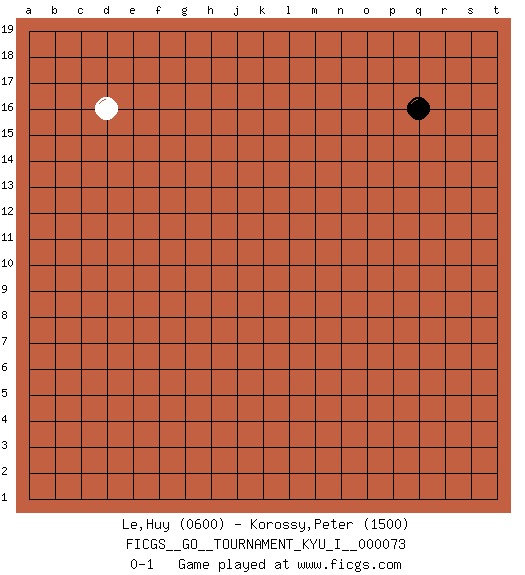 Last move : 0-1 2018 February 27 3:34:55 [Event "FICGS__GO__TOURNAMENT_KYU_I__000073"] [Site "FICGS"] [Date "2018.01.26"] [Round "1"] [Black "Le,Huy"] [White "Korossy,Peter"] [Result "0-1"] [Rating 1 "0600"] [Rating 2 "1500"] 1.q16 d16 0-1 This go game has been lost on time (started : 2018.01.26 14:36:42) Here are the names of the openings (joseki) played in the four corners : Player White won this Go (weiqi, baduk) game. Follow this game move after move (download)Play slow, win slow; play fast, lose fast. (Anonymous) To err is human, but to really foul things up requires a computer. (Farmer's Almanac, 1978)