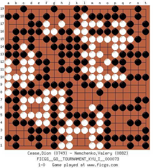 Last move : 1-0 2018 October 8 17:54:41 [Event "FICGS__GO__TOURNAMENT_KYU_I__000073"] [Site "FICGS"] [Date "2018.01.26"] [Round "1"] [Black "Cease,Dion"] [White "Nemchenko,Valery"] [Result "1-0"] [Rating 1 "0749"] [Rating 2 "0882"] 1.d16 q4 2.c4 q16 3.f3 f5 4.r14 p14 5.r17 p17 6.r16 q15 7.s13 q14 8.k17 l15 9.k15 k14 10.j15 j14 11.h14 k16 12.j16 l16 13.h13 j13 14.h12 j12 15.j11 k11 16.k10 l10 17.k12 l11 18.l14 l13 19.k13 m14 20.l12 k14 21.l9 m10 22.m9 m12 23.n10 n11 24.m11 o12 25.c10 l17 26.h4 e5 27.d4 d5 28.b6 c5 29.b5 c6 30.c8 c7 31.d8 d7 32.g6 f6 33.g7 f7 34.e8 e7 35.g5 f8 36.b7 g8 37.f10 o10 38.o3 n9 39.n8 m10 40.o5 l11 41.q2 q3 42.r2 r3 43.s2 s3 44.q6 q5 45.r6 r5 46.s6 s5 47.p6 p5 48.o4 p4 49.k18 l18 50.h18 j14 51.q18 q17 52.p18 o18 53.p9 p10 54.q9 q10 55.r10 r11 56.s10 s11 57.o9 n10 58.t10 t11 59.q13 p13 60.q12 r18 61.s18 r19 62.s19 q19 63.p19 o19 64.q11 r12 65.r13 t12 66.l19 m19 67.k19 c17 68.c16 b17 69.d17 c18 70.d18 d19 71.b16 a16 72.b15 a15 73.a14 a17 74.b14 t2 75.p2 p3 76.j13 k11 77.l10 j10 78.j9 h10 79.h9 g10 80.g9 g11 81.f11 g12 82.f12 g13 83.g14 f13 84.e13 f14 85.f15 e14 86.d14 b3 87.b4 a4 88.m18 n19 89.o17 n17 90.n18 m17 91.o16 o15 92.n16 n15 93.l14 k14 94.m16 m15 95.p16 p15 96.o18 r15 97.s15 e15 98.e16 f16 99.g15 d13 100.e12 d12 101.f9 h8 102.j8 h7 103.j7 h6 104.g4 f4 105.e3 e4 106.j6 s16 107.t16 s17 108.t17 p11 109.m11 l11 110.k11 m11 111.p12 n13 112.j14 e18 113.f18 f19 114.g19 e19 115.e17 f17 116.c19 b19 117.a18 a19 118.b18 c14 119.d15 b13 120.l14 m13 121.k14 o2 122.n2 s1 123.r1 t4 124.t1 t6 125.s7 s1 126.t7 c11 127.t1 c3 128.d3 c2 129.a2 a3 130.d2 d1 131.e1 c1 132.b1 f1 133.e2 f2 134.a5 b10 135.b2 g2 136.h2 j2 137.g3 h1 138.g1 j1 139.h11 c9 140.b9 d10 141.d9 c10 142.e10 d11 143.t3 k3 144.t2 l3 145.t5 m2 146.s4 n3 147.o1 m1 148.r4 n1 149.o2 n4 150.m4 n5 151.m5 m6 152.n6 m3 153.l5 h5 154.j5 j4 155.k4 j3 156.t13 h3 157.g2 a9 158.b8 a8 159.a7 a10 160.a13 a12 161.b12 a11 162.c13 c12 163.b13 l4 164.k5 g16 165.s12 h17 166.h16 1-0 Here are the names of the openings (joseki) played in the four corners : Corner q16 : q16 r14 Hoshi (Hwajeom, Seongjeom, Xingwei`) 4-4 Point. The star or hoshi (4-4) point, emphasizing influence at the potential expense of territory. Ikken Kakari (Hankan Keolch'im, Yi Gua`jiao~, 1-Space Low Approach). Black 2 is the standard approach move to the 4-4. Corner q4 : q4 l9 Hoshi (Hwajeom, Seongjeom, Xingwei`) 4-4 Point. The star or hoshi (4-4) point, emphasizing influence at the potential expense of territory. Player Black won this Go (weiqi, baduk) game. Follow this game move after move (download)Win the early ko to win the game. (Anonymous) The production of too many useful things results in too many useless people. (Karl Marx)