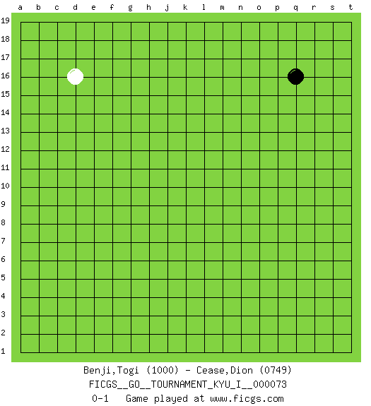 Last move : 0-1 2018 March 10 17:4:24 [Event "FICGS__GO__TOURNAMENT_KYU_I__000073"] [Site "FICGS"] [Date "2018.01.26"] [Round "1"] [Black "Benji,Togi"] [White "Cease,Dion"] [Result "0-1"] [Rating 1 "1000"] [Rating 2 "0749"] 1.q16 d16 0-1 This go game has been lost on time (started : 2018.01.26 14:36:42) Here are the names of the openings (joseki) played in the four corners : Player White won this Go (weiqi, baduk) game. Follow this game move after move (download)When your opponent is thick, you must also become thick. (Otake Hideo, 9p) Wisdom doesn't necessarily come with age. Sometimes age just shows up all by itself. (Tom Watson)