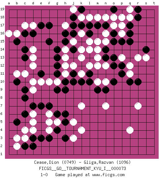 Last move : 1-0 2018 July 26 12:19:36 [Event "FICGS__GO__TOURNAMENT_KYU_I__000073"] [Site "FICGS"] [Date "2018.01.26"] [Round "1"] [Black "Cease,Dion"] [White "Gliga,Razvan"] [Result "1-0"] [Rating 1 "0749"] [Rating 2 "1096"] 1.d16 d4 2.q16 q4 3.c6 d14 4.f17 p17 5.q17 p16 6.q15 q18 7.r18 q19 8.f3 f4 9.g4 f5 10.d3 c3 11.e3 d5 12.c2 b3 13.c9 c11 14.b5 c4 15.e7 k4 16.h3 j3 17.g6 f6 18.f7 g5 19.h5 j5 20.h6 b2 21.d2 d6 22.d7 h17 23.p15 n16 24.o15 n15 25.o16 o17 26.n17 n18 27.m17 m18 28.l17 l18 29.k17 l15 30.k15 l14 31.n14 m15 32.j18 k18 33.j17 k14 34.h15 h14 35.g14 h13 36.g13 c17 37.c16 d17 38.e17 b16 39.b15 a16 40.c14 d13 41.g12 h12 42.g11 h11 43.h10 g10 44.h9 f10 45.f15 d10 46.b10 b11 47.c13 d12 48.e11 e10 49.g9 d9 50.c8 j15 51.j16 k16 52.h16 j19 53.r19 p18 54.o19 o18 55.k19 r13 56.s14 s13 57.r10 q11 58.q10 r7 59.p11 q12 60.p12 p13 61.o13 m12 62.o10 n10 63.n9 m10 64.k10 k7 65.m9 n7 66.k12 l12 67.l10 n12 68.o12 k11 69.j11 j12 70.l11 k13 71.l16 m14 72.n13 m13 73.j14 k11 74.j10 1-0 Here are the names of the openings (joseki) played in the four corners : Corner d4 : d4 c6 Hoshi (Hwajeom, Seongjeom, Xingwei`) 4-4 Point. The star or hoshi (4-4) point, emphasizing influence at the potential expense of territory. Ikken Kakari (Hankan Keolch'im, Yi Gua`jiao~, 1-Space Low Approach). Black 2 is the standard approach move to the 4-4. Corner d16 : d16 d14 Hoshi (Hwajeom, Seongjeom, Xingwei`) 4-4 Point. The star or hoshi (4-4) point, emphasizing influence at the potential expense of territory. Ikken Takagakari (Hankan Nop'dakeolch'im, Yi Gaojia, 1-Space High Approach). Black typically responds at 6-4 or 3-10. Black 4-10 is played when Black finds play on the right side advantageous. Black 4-8 or 3-8 may be played when Black has support at top. Corner q16 : q16 p17 Hoshi (Hwajeom, Seongjeom, Xingwei`) 4-4 Point. The star or hoshi (4-4) point, emphasizing influence at the potential expense of territory. Player Black won this Go (weiqi, baduk) game. Follow this game move after move (download)With only one group, you will win. (Anonymous) When you have everything, sometimes it feels like nothing. (Horatio Caine, C.S.I. Miami)