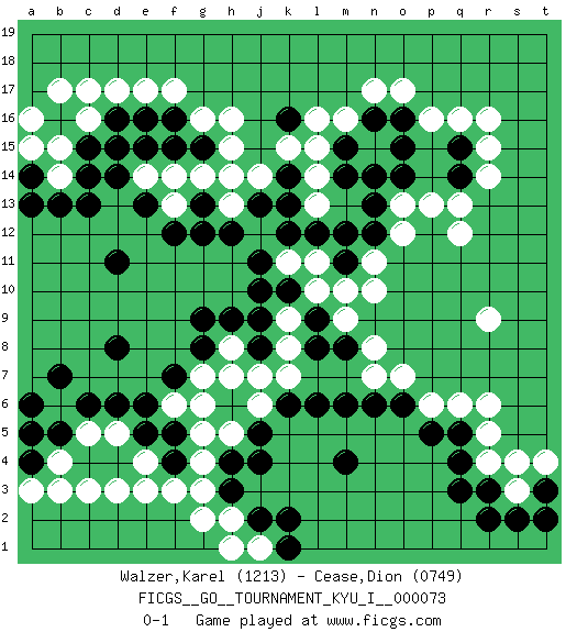 Last move : 0-1 2018 August 21 19:55:17 [Event "FICGS__GO__TOURNAMENT_KYU_I__000073"] [Site "FICGS"] [Date "2018.01.26"] [Round "1"] [Black "Walzer,Karel"] [White "Cease,Dion"] [Result "0-1"] [Rating 1 "1213"] [Rating 2 "0749"] 1.d4 q16 2.q3 c16 3.d16 d17 4.e16 e17 5.c15 f17 6.b16 c17 7.f16 g16 8.g15 h15 9.f15 h16 10.d11 r5 11.q5 q6 12.p5 r4 13.r3 r9 14.m4 o17 15.q14 q12 16.o14 g14 17.e13 d15 18.d14 b15 19.c14 f3 20.h3 c3 21.c4 d3 22.f4 e4 23.e5 e3 24.d6 g4 25.f5 g3 26.h4 g5 27.j5 r16 28.n16 n17 29.k16 m16 30.m15 n15 31.n14 l15 32.m14 l16 33.o16 p16 34.o15 p6 35.o6 o7 36.n6 n7 37.m6 o12 38.m12 n10 39.l9 r14 40.k13 j14 41.h12 g7 42.d8 b4 43.b5 b3 44.g9 b6 45.a5 c5 46.c6 d5 47.b7 s3 48.s2 s4 49.r2 f14 50.e15 e14 51.d15 b14 52.b13 b17 53.c13 h2 54.j2 g2 55.f7 j6 56.k6 j7 57.j8 k7 58.l6 h5 59.j4 j1 60.k1 h1 61.k2 l10 62.k10 l11 63.k12 k11 64.j11 k9 65.j10 m9 66.l8 k8 67.m8 n8 68.k14 k15 69.g13 q13 70.q15 r15 71.g8 g6 72.j9 n11 73.m11 m10 74.n12 o13 75.t3 t4 76.t2 f13 77.f12 h14 78.a14 a16 79.j13 h13 80.g12 f6 81.e6 h8 82.h9 h7 83.q4 r6 84.n13 l13 85.l12 l14 86.a4 a3 87.a6 a15 88.a13 p13 0-1 Here are the names of the openings (joseki) played in the four corners : Corner d16 : c16 d16 Komoku (Somok, Xiao~mu`) 3-4 Point. The komoku (3-4) point is the traditional corner enclosure move.. Corner q4 : q3 r5 Komoku (Somok, Xiao~mu`) 3-4 Point. The komoku (3-4) point is the traditional corner enclosure move.. Ikken Kakari (Hankan Keolch'im, Yi Gua`jiao~, 1-Space Low Pincer). The small knight move is the basic approach move to the 3-4 point stone. It has been continually used for over four centuries. There are limitless variations, with new moves constantly being discovered. White 2 opens the door to a treaure store of joseki. Corner d4 : d4 f3 Hoshi (Hwajeom, Seongjeom, Xingwei`) 4-4 Point. The star or hoshi (4-4) point, emphasizing influence at the potential expense of territory. Ikken Kakari (Hankan Keolch'im, Yi Gua`jiao~, 1-Space Low Approach). White 2 is the standard approach move to the 4-4. Player White won this Go (weiqi, baduk) game. Follow this game move after move (download)The rectangular six is normally alive. (Anonymous) Employ the attack like tactic of defense. (Chinese proverb)