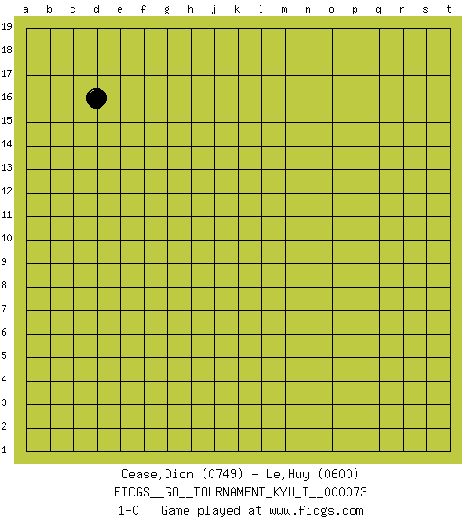 Last move : 1-0 2018 March 9 17:4:25 [Event "FICGS__GO__TOURNAMENT_KYU_I__000073"] [Site "FICGS"] [Date "2018.01.26"] [Round "1"] [Black "Cease,Dion"] [White "Le,Huy"] [Result "1-0"] [Rating 1 "0749"] [Rating 2 "0600"] 1.d16 1-0 This go game has been lost on time (started : 2018.01.26 14:36:42) Here are the names of the openings (joseki) played in the four corners : Player Black won this Go (weiqi, baduk) game. Follow this game move after move (download)In the sound of the stone you can hear its purpose. (Pierre Audouard) Train yourself to let go of everything you fear to lose. (Master Yoda in Star Wars ep.3)