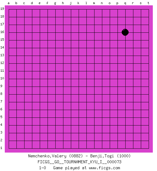 Last move : 1-0 2018 February 26 3:30:58 [Event "FICGS__GO__TOURNAMENT_KYU_I__000073"] [Site "FICGS"] [Date "2018.01.26"] [Round "1"] [Black "Nemchenko,Valery"] [White "Benji,Togi"] [Result "1-0"] [Rating 1 "0882"] [Rating 2 "1000"] 1.q16 1-0 This go game has been lost on time (started : 2018.01.26 14:36:42) Here are the names of the openings (joseki) played in the four corners : Player Black won this Go (weiqi, baduk) game. Follow this game move after move (download)You don't have to be really good anymore to get good results. What's happening with chess is that it's gradually losing its place as the par excellence of intellectual activity. Smart people in search of a challenging board game might try a game called Go. (Hans Berliner, The New York Times, 2003) We need strong personalities and only one world champion to attract sponsors. (Anatoly Karpov)