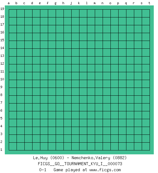 Last move : 0-1 2018 February 25 15:26:49 [Event "FICGS__GO__TOURNAMENT_KYU_I__000073"] [Site "FICGS"] [Date "2018.01.26"] [Round "1"] [Black "Le,Huy"] [White "Nemchenko,Valery"] [Result "0-1"] [Rating 1 "0600"] [Rating 2 "0882"] 0-1 This go game has been lost on time (started : 2018.01.26 14:36:42) Here are the names of the openings (joseki) played in the four corners : Player White won this Go (weiqi, baduk) game. Follow this game move after move (download)In opponents' sphere of influence, avoid sharp conflict, don't move too deep. (Otake Hideo, 9p) Establishing goals is all right if you don't let them deprive you of interesting detours. (Doug Larson)
