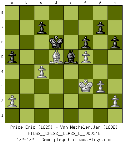 Last move : 1/2-1/2 2018 April 1 17:30:18 [Event "FICGS__CHESS__CLASS_C__000248"] [Site "FICGS"] [Date "2018.01.27"] [Round "1"] [White "Price,Eric"] [Black "Van Mechelen,Jan"] [Result "1/2-1/2"] [WhiteElo "1629"] [BlackElo "1692"] 1.e4 e5 2.Nf3 Nc6 3.Bb5 a6 4.Ba4 Nf6 5.O-O b5 6.Bb3 Bb7 7.d3 Be7 8.c3 O-O 9.Re1 Re8 10.Nbd2 Bf8 11.Nf1 h6 12.Bc2 d5 13.Ng3 Qd7 14.d4 Nxe4 15.Nxe4 dxe4 16.Bxe4 exd4 17.Nxd4 Nxd4 18.Bxb7 Ne2+ 19.Kf1 Qxd1 20.Rxd1 Rab8 21.Bf3 Nxc1 22.Raxc1 Bd6 23.Re1 Rxe1+ 24.Rxe1 a5 25.Bc6 b4 26.Re8+ Rxe8 27.Bxe8 Kf8 28.Bc6 Ke7 29.g3 bxc3 30.bxc3 Be5 31.c4 Kd6 32.Bd5 f6 33.Ke2 Kc5 34.f4 Bd6 35.f5 Be5 36.Kf3 Kd6 37.Kg4 Ke7 38.Kf3 Kd6 39.Kg4 Ke7 40.Kf3 Kd6 1/2-1/2 Ruy Lopez : Archangelsk (counterthrust) variation Kingside Castling by player White (move 5) Kingside Castling by player Black (move 8) This chess game ended in a draw. Follow this game move after move (download)I have always a slight feeling of pity for the man who has no knowledge of Chess. (Siegbert Tarrasch) Ich habe Kasparov in Rente geschickt. (Veselin Topalov) Uno no tiene que jugar muy bien, es suficiente jugar mejor que el oponente. (Siegbert Tarrasch) Un footballeur joue avec ses pieds, parfois avec sa tête. Un joueur d'échecs ne joue qu'avec sa tête. Et quand il ne joue plus, il meurt. (Jacob Murray) Only sick music makes money today. (Friedrich Nietzsche)