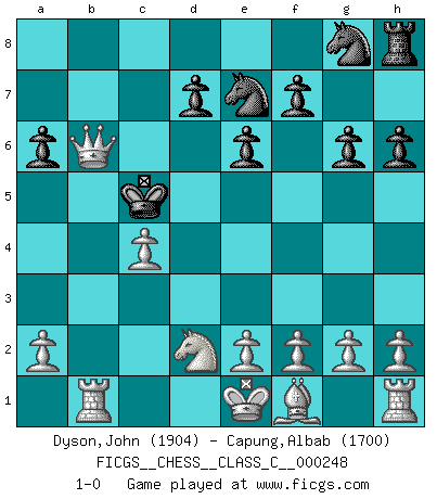 Last move : 1-0 2018 March 15 12:43:37 [Event "FICGS__CHESS__CLASS_C__000248"] [Site "FICGS"] [Date "2018.01.27"] [Round "1"] [White "Dyson,John"] [Black "Capung,Albab"] [Result "1-0"] [WhiteElo "1904"] [BlackElo "1700"] 1.Nf3 e6 2.c4 a6 3.d4 c5 4.d5 Qa5+ 5.Nc3 g6 6.b4 cxb4 7.Ne4 b3 8.Bd2 Bb4 9.Qxb3 Bxd2+ 10.Nfxd2 h6 11.Nd6+ Ke7 12.Nxc8+ Kd8 13.Nd6 Ke7 14.Nxb7 Qc7 15.d6+ Qxd6 16.Nxd6 Kxd6 17.Qb4+ Kc7 18.Rb1 Nc6 19.Qb7+ Kd6 20.Qxa8 Nce7 21.Qb8+ Kc5 22.Qb6+ 1-0 Reti Opening Player White won this chess game. Follow this game move after move (download)Life is like a game of Chess, changing with each move. (Chinese proverb) Ich kenne Menschen, die allen Willen der Welt besitzen und doch nicht Schach spielen können. (Robert James Fischer) El Ajedrez demanda una total concentración. (Bobby Fischer) Comme les marins qui ont mille raisons différentes d'aller en mer, les joueurs d'échecs en ont tout autant avant de s'installer devant une table et jouer... (Vincent Bertignac, philosophe) Wisdom is the reward you get for a lifetime of listening when you'd have preferred to talk. (Doug Larson)