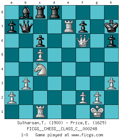 Last move : 1-0 2018 June 1 12:33:9 [Event "FICGS__CHESS__CLASS_C__000248"] [Site "FICGS"] [Date "2018.01.27"] [Round "1"] [White "Sutharsan,Thirunathan"] [Black "Price,Eric"] [Result "1-0"] [WhiteElo "1900"] [BlackElo "1629"] 1.e4 e5 2.Nf3 Nc6 3.Bc4 Nf6 4.Ng5 d5 5.exd5 Na5 6.Bb5+ c6 7.dxc6 bxc6 8.Be2 h6 9.Nf3 e4 10.Ne5 Bd6 11.d4 exd3 12.Nxd3 Qc7 13.b3 O-O 14.Bb2 Ne4 15.h3 Nb7 16.O-O Nbc5 17.Nc3 Rd8 18.Nxe4 Nxe4 19.Bg4 Ba6 20.c4 Qb6 21.Qc2 Bc8 22.Bxc8 Raxc8 23.Rac1 Bb8 24.Rfe1 Ng3 25.c5 Qb5 26.Ne5 Nh5 27.Qf5 Nf6 28.Nc4 Qb7 29.Bxf6 gxf6 30.Qxf6 Kh7 31.Re7 1-0 Two knights defense Kingside Castling by player Black (move 13) Kingside Castling by player White (move 16) Player White won this chess game. Follow this game move after move (download)Chess holds its master in its own bonds, shackling the mind and brain so that the inner freedom of the very strongest must suffer. (Albert Einstein) Die unerbitterlichsten Regeln im Schach sind die Ausnahmen. (Savielly Grigorievitsch Tartakower) Si tu oponente no puede hacer nada activo, entonces no apures la posición; En vez de eso, dejalo estar sentado ahí, sufriendo y rogandote por un empate. (Jeremy Silman) Tout change constamment, y compris dans le monde des Echecs. (Botvinnik) The quality of decision is like the well-timed swoop of a falcon which enables it to strike and destroy its victim. (Sun Tzu)