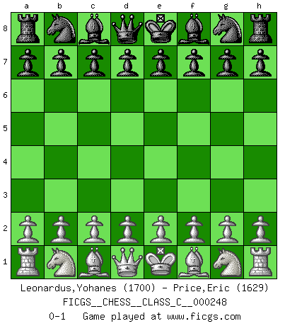 Last move : 0-1 2018 March 8 4:49:57 [Event "FICGS__CHESS__CLASS_C__000248"] [Site "FICGS"] [Date "2018.01.27"] [Round "1"] [White "Leonardus,Yohanes"] [Black "Price,Eric"] [Result "0-1"] [WhiteElo "1700"] [BlackElo "1629"] 0-1 This chess game has been lost on time (started : 2018.01.27 1:11:42) Player Black won this chess game. Follow this game move after move (download)Life is like a game of Chess, changing with each move. (Chinese proverb) Ein Springer auf f6 gegen die eigene Rochadestellung ist schlimmer als ein rostiger Nagel im Knie. (Efim Bogoljubov) Fischer deseaba darle a los Rusos una sopa de su propia medicina. (Larry Evans) Il s'avisa de me proposer d'apprendre les échecs qu'il jouait un peu... me voilà forcené des échecs. J'achète un échiquier, je m'enferme dans ma chambre, j'y passe des jours et des nuits à vouloir apprendre par cur toutes les parties. (Jean-Jacques Rousseau, Confessions) The only difference between a tax man and a taxidermist is that the taxidermist leaves the skin. (Mark Twain)