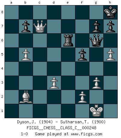 Last move : 1-0 2018 August 14 10:11:14 [Event "FICGS__CHESS__CLASS_C__000248"] [Site "FICGS"] [Date "2018.01.27"] [Round "1"] [White "Dyson,John"] [Black "Sutharsan,Thirunathan"] [Result "1-0"] [WhiteElo "1904"] [BlackElo "1900"] 1.Nf3 d5 2.g3 e6 3.Bg2 c6 4.O-O f5 5.d3 Nf6 6.Nbd2 Bc5 7.c4 O-O 8.Qc2 Qe7 9.a3 e5 10.cxd5 cxd5 11.Nxe5 Qxe5 12.Qxc5 Qxe2 13.Qc3 Nc6 14.Nf3 Qe8 15.Re1 Qh5 16.b4 a6 17.a4 Bd7 18.b5 axb5 19.axb5 Rxa1 20.Qxa1 Nd8 21.Ne5 Be6 22.Qd4 Ng4 23.h4 Nxe5 24.Qxe5 Re8 25.Bxd5 Nf7 26.Bxe6 Kh8 27.Qc7 Nd8 28.Re5 Nxe6 29.Rxe6 Rxe6 30.Bb2 Qg6 31.h5 1-0 Reti : King's Indian attack (Barcza system) Kingside Castling by player White (move 4) Kingside Castling by player Black (move 7) Player White won this chess game. Follow this game move after move (download)Chess is a terrible game. If you have no center, your opponent has a freer position. If you do have a center, then you really have something to worry about ! (Siegbert Tarrasch) Die meiste Zeit treffe ich auf Gegner, die meine Enkel sein könnten. Ich bin da, um ihnen zu zeigen, dass sie von mir noch einiges lernen können. (Viktor Kortschnoi) Algunos sacrificios son sólidos, los demás son míos. (Mikhail Tal) Des points faibles ou des trous dans la position de l'adversaire doivent être occupés par des pièces et non pas par des pions. (Siegbert Tarrasch) Vladimir Ras-Putin is still alive... He is also a good actor, I saw him in the Lord of the Rings. (Rodolfo d'Ettorre)