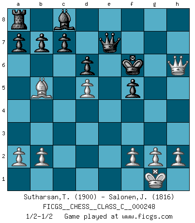 Last move : 1/2-1/2 2018 March 2 6:51:39 [Event "FICGS__CHESS__CLASS_C__000248"] [Site "FICGS"] [Date "2018.01.27"] [Round "1"] [White "Sutharsan,Thirunathan"] [Black "Salonen,Jukka"] [Result "1/2-1/2"] [WhiteElo "1900"] [BlackElo "1816"] 1.e4 e5 2.Nf3 Nc6 3.Bc4 Bc5 4.c3 Nf6 5.d4 exd4 6.cxd4 Bb4+ 7.Nc3 Nxe4 8.O-O Bxc3 9.d5 Bf6 10.Re1 Ne7 11.Rxe4 d6 12.Bg5 Bxg5 13.Nxg5 O-O 14.Nxh7 Kxh7 15.Qh5+ Kg8 16.Rh4 f5 17.Qh7+ Kf7 18.Rh6 Rg8 19.Re1 Qf8 20.Bb5 Rh8 21.Qxh8 gxh6 22.Qh7+ Kf6 23.Rxe7 Qxe7 24.Qxh6+ 1/2-1/2 Giuoco Piano : Greco's attack Kingside Castling by player White (move 8) Kingside Castling by player Black (move 13) This chess game ended in a draw. Follow this game move after move (download)Nothing excites jaded Grandmasters more than a theoretical novelty. (Dominic Lawson) Auf Remis zu spielen ist gewissermaßen ein Verbrechen gegen das Schachspiel. (Mikhail Nekhemyevich Tal) La caracteristica mas importante en la posición del Ajedrez es la actividad de las piezas. Esto es absolutamente fundamental en todas las fases del juego: Apertura, Juego Medio y especialmente Finales. La limitación primordial en la actividad de una pieza, es la estructuración de los Peones. (Michael Stean) Le pion, dans sa simplicité, marche droit devant lui, mais lorsqu'il prend, il le fait obliquement? Ainsi l'homme, tant qu'il reste pauvre, marche dans la droiture et vit honnêtement, mais lorsqu'il recherche les honneurs, il flatte, se parjure et, par les voies obliques, cherche une position supérieure sur l'échiquier du monde. (Jean de Galles) We're missing something. (Gregory House, House M.D.)