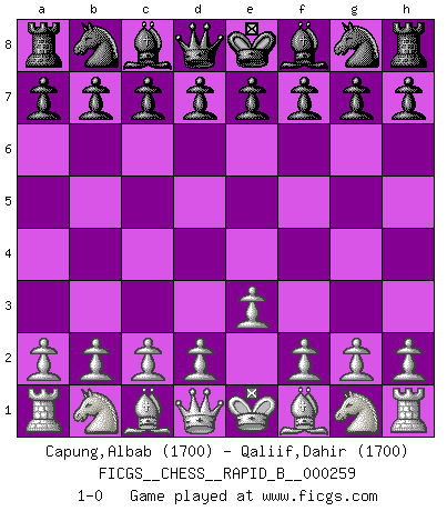 Last move : 1-0 2018 February 27 3:34:55 [Event "FICGS__CHESS__RAPID_B__000259"] [Site "FICGS"] [Date "2018.01.27"] [Round "1"] [White "Capung,Albab"] [Black "Qaliif,Dahir"] [Result "1-0"] [WhiteElo "1700"] [BlackElo "1700"] 1.e3 1-0 This chess game has been lost on time (started : 2018.01.27 15:2:41) Van't Kruijs Opening Player White won this chess game. Follow this game move after move (download)It is the aim of the modern school, not to treat every position according to one general law, but according to the principle inherent in the position. (Richard Reti) Sicherlich können nur Meister einen Stil haben. Daß ein nicht-Meister auch nur ein einziges Mal in seinem Leben eine Partie folgerecht durchführte, habe ich niemals bemerkt. (Emanuel Lasker) El Rey es una pieza de pelea. ¡Usenlo!. (Wilhelm Steinitz) Je ne crois pas en la psychologie, je crois aux bons coups. (Robert Fischer) First of all, we have to go back to the classical time control. (Anatoly Karpov)