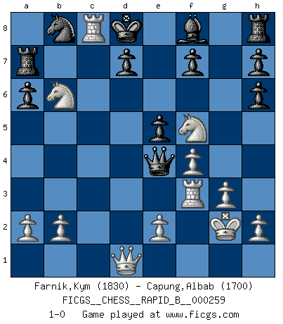 Last move : 1-0 2018 January 30 3:26:1 [Event "FICGS__CHESS__RAPID_B__000259"] [Site "FICGS"] [Date "2018.01.27"] [Round "1"] [White "Farnik,Kym"] [Black "Capung,Albab"] [Result "1-0"] [WhiteElo "1830"] [BlackElo "1700"] 1.Nf3 e6 2.c4 c5 3.Nc3 a6 4.g3 b6 5.Bg2 Bb7 6.O-O Nh6 7.d4 cxd4 8.Nxd4 Bxg2 9.Kxg2 Qf6 10.Bf4 e5 11.Nd5 Qd6 12.Bxh6 gxh6 13.Nf5 Qc6 14.f4 Qxc4 15.Rc1 Qe4+ 16.Rf3 Kd8 17.Nxb6 Ra7 18.Rc8+ 1-0 Reti Opening Kingside Castling by player White (move 6) Player White won this chess game. Follow this game move after move (download)The older I grow, the more I value pawns. (Paul Keres) Ich verstehe mehr vom Schach als irgendein anderer lebender Meister. (José Raúl Capablanca) Fischer no está bajo la obligación de nadie. (Joseph Platz) Même si l'adversaire joue le coup analysé précédemment, recommencez l'analyse en voyant la nouvelle position. Première règle de Blumenfeld Whenever people agree with me, I always feel I must be wrong. (Oscar Wilde)