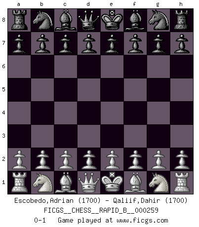 Last move : 0-1 2018 February 26 15:30:43 [Event "FICGS__CHESS__RAPID_B__000259"] [Site "FICGS"] [Date "2018.01.27"] [Round "1"] [White "Escobedo,Adrian"] [Black "Qaliif,Dahir"] [Result "0-1"] [WhiteElo "1700"] [BlackElo "1700"] 0-1 This chess game has been lost on time (started : 2018.01.27 15:2:41) Player Black won this chess game. Follow this game move after move (download)Chess opens and enriches your mind. (Saudin Robovic) Der Verteidiger gebe der Gewalt nach, aber nur der Gewalt. Er schaffe sich nicht freiwillig, etwa aus Blindheit oder aus Schrecken, irgendwelche Schwächen. Er lasse sich nicht bluffen. (Emanuel Lasker) El ganar no lo es todo... pero el perder es nada. (Mednis) C'est une question de caractère, Beaucoup de gens perdent leur motivation très vite. D'autres, ils sont rares, peuvent la conserver très longtemps. J'aime les échecs, encore aujourd'hui je suis heureux d'analyser des parties. J'aime toujours gagner, je déteste encore perdre. Bien jouer est important pour mon intégrité intellectuelle et morale. Et puis les échecs vivent en ce moment une période historique grâce à Internet. Ils se développent dans les systèmes éducatifs à travers le monde. Ils sortent de leur ghetto, et c'est mon rôle de mener à bien cette révolution. (Gary Kasparov) The human is the only animal species whose members are able to talk themselves into difficulties that would not otherwise exist. (Wendell Johnson)