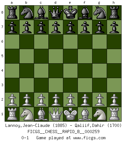 Last move : 0-1 2018 February 26 15:30:43 [Event "FICGS__CHESS__RAPID_B__000259"] [Site "FICGS"] [Date "2018.01.27"] [Round "1"] [White "Lannoy,Jean-Claude"] [Black "Qaliif,Dahir"] [Result "0-1"] [WhiteElo "1885"] [BlackElo "1700"] 0-1 This chess game has been lost on time (started : 2018.01.27 15:2:41) Player Black won this chess game. Follow this game move after move (download)Fischer Chess play was always razor-sharp, rational and brilliant. One of the best ever. (Dave Regis) Der Bart als Geschlechtszeichen mitten im Gesicht ist obszön. Daher gefällt er den Weibern. [Zugegeben, kein Schachzitat, aber unglaublich originell] (Arthur Schopenhauer) Algunos sacrificios son sólidos, los demás son míos. (Mikhail Tal) J'apprécie les joueurs d'est-indienne, c'est grâce à eux que je nourris ma famille depuis tant d'années. (Petrosian) No man has ever achieved immortality in his own life time. (Unknown)