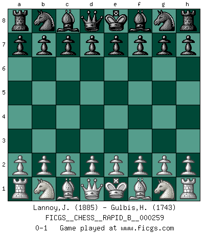 Last move : 0-1 2018 February 26 15:30:43 [Event "FICGS__CHESS__RAPID_B__000259"] [Site "FICGS"] [Date "2018.01.27"] [Round "1"] [White "Lannoy,Jean-Claude"] [Black "Gulbis,Harijs"] [Result "0-1"] [WhiteElo "1885"] [BlackElo "1743"] 0-1 This chess game has been lost on time (started : 2018.01.27 15:2:41) Player Black won this chess game. Follow this game move after move (download)Checkers is for tramps. (Paul Morphy) Der Freibauer hat für mich eine Seele, genau wie der Mensch, Wünsche, die unerkannt in ihm schlummern, und Befürchtungen, von deren Existenz er selbst kaum ahnt. (Aaron Nimzowitsch) El jugador táctico debe saber que hacer cuando algo se debe de hacer. El estratégico debe saber que hacer cuando nada se debe de hacer. (Savielly Tartakover) Je ne crois pas en la psychologie, je crois aux bons coups. (Robert Fischer) To be champion requires more than simply being a strong player; one has to be a strong human being as well. (Anatoly Karpov)