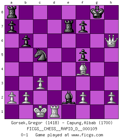 Last move : 0-1 2018 April 2 19:56:37 [Event "FICGS__CHESS__RAPID_D__000109"] [Site "FICGS"] [Date "2018.01.27"] [Round "1"] [White "Gorsek,Gregor"] [Black "Capung,Albab"] [Result "0-1"] [WhiteElo "1418"] [BlackElo "1700"] 1.e4 e6 2.d4 c5 3.c3 h6 4.Nf3 Qb6 5.Qb3 Qc6 6.d5 exd5 7.exd5 Qf6 8.Be3 b6 9.Nbd2 Ne7 10.Ne4 Qg6 11.Bd3 Ng8 12.Bf4 Qxg2 13.O-O-O Qxf3 14.Bg3 c4 15.Qxc4 Ba6 16.Qc7 Be7 17.Rhe1 Nf6 18.Nxf6+ gxf6 19.d6 O-O 20.dxe7 Re8 21.Re3 Qg4 22.Bf4 Bxd3 23.Rg3 Qxg3 24.Bxg3 Na6 25.Qxd7 Nc5 26.Qg4+ Kh7 27.Bd6 f5 28.Qh4 Be2 29.Bf4 Rxe7 30.Qxh6+ Kg8 0-1 This chess game has been lost on time (started : 2018.01.27 21:58:33) French defense Queenside Castling by player White (move 13) Kingside Castling by player Black (move 19) Player Black won this chess game. Follow this game move after move (download)Chess is ruthless: you've got to be prepared to kill people. (Nigel Short) Nicht daß Diemer aus Opportunismus Mitglied der NSDAP geworden wäre. Er war ein Fanatiker, in allem, was er tat. (Hans Ree) El Ajedrez es un invernadero donde los frutos del carácter pueden madurar mas completamente que en la vida. (Edward Morgan Foster) Les échecs sont un jeu terrible. Si vous n'avez pas le centre, votre adversaire a une position plus libre. Par contre, si vous avez le centre, alors vous avez vraiment quelque chose pour laquelle vous inquiéter ! (Siegbert Tarrasch) Without enthusiasm, virtue functions not at all, and vice only poorly. (Mignon McLaughlin, The Neurotic's Notebook, 1960)