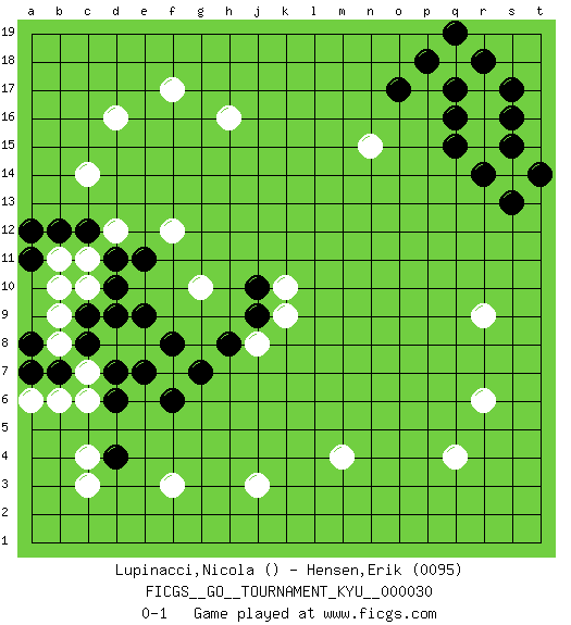 Last move : 0-1 2007 May 15 23:14:58 [Event "FICGS__GO__TOURNAMENT_KYU__000030"] [Site "FICGS"] [Date "2007.04.22"] [Round "1"] [Black "Lupinacci,Nicola"] [White "Hensen,Erik"] [Result "0-1"] [Rating 2 "0095"] 1.q16 q4 2.d4 d16 3.o17 r15 4.q15 r16 5.r14 r17 6.q17 q18 7.p18 f3 8.q19 c3 9.r18 s14 10.s13 c4 11.t14 j3 12.s15 r6 13.s17 m4 14.s16 d8 15.d9 e8 16.e9 c14 17.f8 h16 18.c8 f7 19.e7 c11 20.d7 b6 21.f6 f17 22.d11 c10 23.d10 r9 24.c12 b8 25.c9 b11 26.b12 b9 27.b7 c6 28.a11 b10 29.a8 c7 30.a7 a6 31.g7 d12 32.a12 f12 33.e11 n15 34.d6 k10 35.j10 k9 36.j9 j8 37.h8 g10 0-1 Here are the names of the openings (joseki) played in the four corners : Corner d4 : d4 f3 Hoshi (Hwajeom, Seongjeom, Xingwei`) 4-4 Point. The star or hoshi (4-4) point, emphasizing influence at the potential expense of territory. Ikken Kakari (Hankan Keolch'im, Yi Gua`jiao~, 1-Space Low Approach). White 2 is the standard approach move to the 4-4. Player White won this Go (weiqi, baduk) game. Follow this game move after move (download)Use a wall to attack, not to make territory. (Anonymous) The real danger is not that computers will begin to think like men, but that men will begin to think like computers. (Sydney J. Harris)