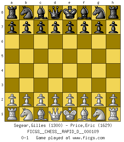Last move : 0-1 2018 February 27 3:34:55 [Event "FICGS__CHESS__RAPID_D__000109"] [Site "FICGS"] [Date "2018.01.27"] [Round "1"] [White "Segear,Gilles"] [Black "Price,Eric"] [Result "0-1"] [WhiteElo "1300"] [BlackElo "1629"] 0-1 This chess game has been lost on time (started : 2018.01.27 21:58:33) Player Black won this chess game. Follow this game move after move (download)By playing at Chess then, we may learn: First: Foresight... Second: Circumspection... Third: Caution... And lastly, we learn by Chess the habit of not being discouraged by present bad appearances in the state of our affairs, the habit of hoping for a favorable chance, and that of persevering in the secrets of resources. (Benjamin Franklin) Charakterschwächen offenbaren sich normalerweise während einer Schachpartie. (Garry Kasparov) El Ajedrez es un cuento de Hadas de las 1001 metidas de pata. (Savielly Tartakower) Si je n'étais pas joueur d'échecs, je serais le meilleur dans quelque chose d'autre. (Anatoli Karpov) The message for business people contemplating their place in the cyberspace is simple and direct: get linked or get lost. (Vic Sussman and Kenan Pollack)