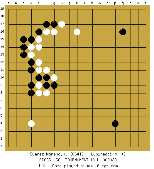 Last move : 1-0 2007 May 15 23:14:26 [Event "FICGS__GO__TOURNAMENT_KYU__000030"] [Site "FICGS"] [Date "2007.04.22"] [Round "1"] [Black "Suarez-Moreno,Alejandro"] [White "Lupinacci,Nicola"] [Result "1-0"] [Rating 1 "0641"] 1.q16 d4 2.p4 k16 3.e16 f16 4.f17 g16 5.g17 h17 6.c15 e15 7.d15 d14 8.c14 e14 9.d12 d13 10.c13 e12 11.d11 e11 12.d9 e9 13.e10 f11 14.f10 g10 15.f9 e8 16.d8 f8 17.g9 1-0 Here are the names of the openings (joseki) played in the four corners : Corner d16 : e16 f16 Takamoku (Gomok, Gaomu`) 5-4 Point. The takamoku (high) point (5-4). With its emphasis on influence, the 5-4 point complements the 4-4 (hoshi) point in creating an influence-oriented fuseki. Corner d4 : d4 d9 Hoshi (Hwajeom, Seongjeom, Xingwei`) 4-4 Point. The star or hoshi (4-4) point, emphasizing influence at the potential expense of territory. Player Black won this Go (weiqi, baduk) game. Follow this game move after move (download)A basic: Don't push too hard. (Jansteen) I fear not the man who has practiced 10,000 kicks once, but I fear the man who has practiced one kick 10,000 times. (Bruce Lee)