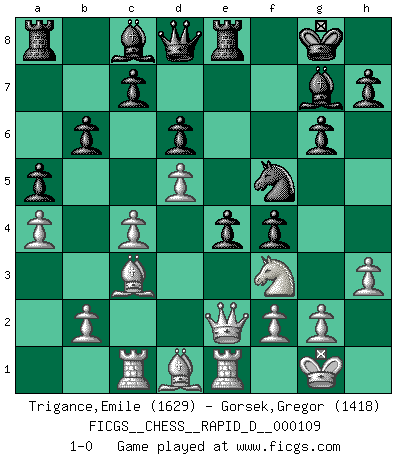 Last move : 1-0 2018 March 29 19:31:59 [Event "FICGS__CHESS__RAPID_D__000109"] [Site "FICGS"] [Date "2018.01.27"] [Round "1"] [White "Trigance,Emile"] [Black "Gorsek,Gregor"] [Result "1-0"] [WhiteElo "1629"] [BlackElo "1418"] 1.e4 g6 2.d4 Bg7 3.c3 d6 4.Bc4 Nf6 5.Qe2 O-O 6.Nf3 Nc6 7.O-O e6 8.Bb3 a5 9.a4 e5 10.d5 Ne7 11.h3 Nh5 12.Nh2 Nf6 13.Be3 Nxe4 14.Nd2 Nxd2 15.Bxd2 f5 16.Rac1 b6 17.c4 f4 18.Bc3 Nf5 19.Nf3 Re8 20.Rfe1 e4 21.Bd1 1-0 This chess game has been lost on time (started : 2018.01.27 21:58:33) Robatsch (Modern) defense Kingside Castling by player Black (move 5) Kingside Castling by player White (move 7) Player White won this chess game. Follow this game move after move (download)Tactics flow from a superior position. (Bobby Fischer) Im Spitzenschach von heute geht es nur um Vorbereitung, um tiefgründige, sorgfältige Eröffnungsvorbereitung. (Nigel Short) El Ajedrez es parte de una cultura y si una cultura esta en decadencia, entonces también el Ajedrez declinará. (Mikhail Botvinnik) Karpov est une pièce de musée. (Garry Kasparov) I've never seen so many men wasted so badly. (Blondie in The Good, The Bad and The Ugly)