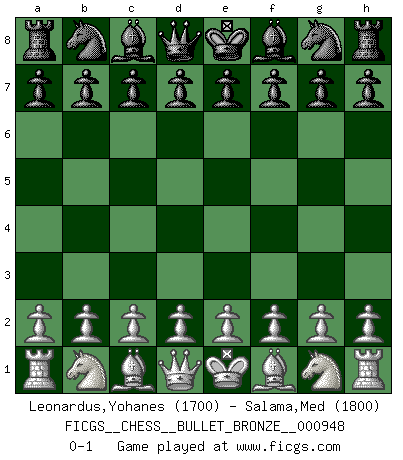 Last move : 0-1 2018 January 28 0:6:34 [Event "FICGS__CHESS__BULLET_BRONZE__000948"] [Site "FICGS"] [Date "2018.01.27"] [Round "1"] [White "Leonardus,Yohanes"] [Black "Salama,Med"] [Result "0-1"] [WhiteElo "1700"] [BlackElo "1800"] 0-1 This chess game has been lost on time (started : 2018.01.27 22:13:41) Player Black won this chess game. Follow this game move after move (download)Who is your opponent tonight, tonight I am playing against the Black pieces. (Akiba Rubinstein) Zum Sieg gelangt man nicht, wenn man gut, sondern nur wenn man besser spielt (Savielly Grigorievitsch Tartakower) En partidas rápidas, el Caballo es mas poderoso que el Alfil. (Vlastimil Hort) La vérité est comme le meilleur coup aux échecs : elle existe, mais il faut la chercher. (Arturo Perez-Reverte) Strategy without tactics is the slowest route to victory. Tactics without strategy is the noise before defeat. (Sun Tzu)