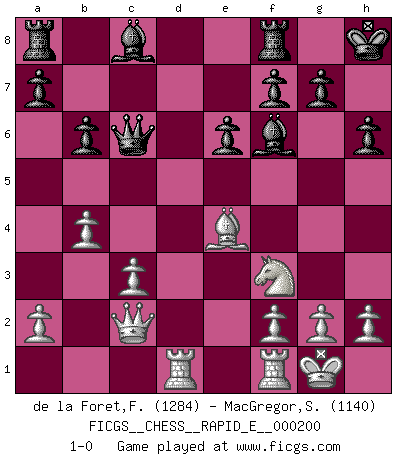 Last move : 1-0 2018 February 27 8:26:51 [Event "FICGS__CHESS__RAPID_E__000200"] [Site "FICGS"] [Date "2018.01.28"] [Round "1"] [White "de la Foret,Fred"] [Black "MacGregor,Steven"] [Result "1-0"] [WhiteElo "1284"] [BlackElo "1140"] 1.e4 e6 2.Nf3 d5 3.Nc3 dxe4 4.Nxe4 Nd7 5.d4 Ngf6 6.Bd3 Nxe4 7.Bxe4 Nf6 8.Bd3 c5 9.Be3 cxd4 10.Bxd4 Be7 11.O-O O-O 12.c3 b6 13.Qc2 h6 14.Rad1 Qc7 15.Be5 Qc5 16.b4 Qc6 17.Bxf6 Bxf6 18.Bh7+ Kh8 19.Be4 1-0 French defense Kingside Castling by player White (move 11) Kingside Castling by player Black (move 11) Player White won this chess game. Follow this game move after move (download)If your opponent offers you a draw, try to work out why he thinks he's worse off. (Nigel Short) Wie, soll nun auch die Opposition abgeschafft werden? Ja, es tut mir leid, Ihnen diesen Schmerz nicht ersparen zu können. (Aaron Nimzowitsch) Cuando me preguntan: -¿Cual es el secreto que te hace hacer mejores movidas que tus oponentes?, Yo respondo: Me da gusto que me pregunten eso, porque, como veran, hay una simple razón. Yo pienso mis propias movidas y dejo a mi oponente que el piense las suyas. (Alexander Alekhine) La menace est plus forte que l'exécution. (Aaron Nimzovitch) Humor is by far the most significant activity of the human brain. (Edward De Bono)