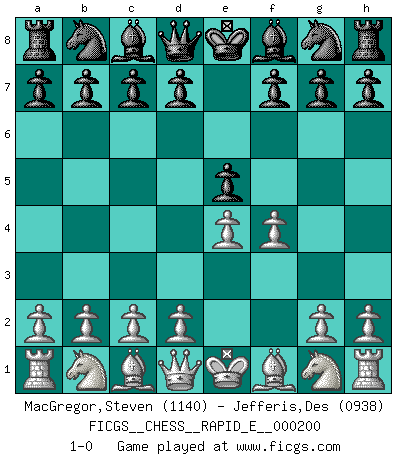 Last move : 1-0 2018 February 28 15:45:25 [Event "FICGS__CHESS__RAPID_E__000200"] [Site "FICGS"] [Date "2018.01.28"] [Round "1"] [White "MacGregor,Steven"] [Black "Jefferis,Des"] [Result "1-0"] [WhiteElo "1140"] [BlackElo "0938"] 1.e4 e5 2.f4 1-0 This chess game has been lost on time (started : 2018.01.28 11:41:22) King's gambit Player White won this chess game. Follow this game move after move (download)Chess is a part of culture and if a culture is declining then Chess too will decline. (Mikhail Botvinnik) Es gibt Leute, die glauben, alles wäre vernünftig, was man mit einem ernsthaften Gesicht tut. (Georg Christoph Lichtenberg) El sobresalir en el Ajedrez es un signo de una mente intrigante. (Sir Arthur Conan Doyle) Les échecs sont utiles à l'exercice de la faculté de penser et à celle de l'imagination. Car nous devons posséder une méthode élaborée pour atteindre des buts partout où nous devons conduire notre raison. (Leibnitz) There is a very easy way to return from a casino with a small fortune : go there with a large one. (Jack Yelton)