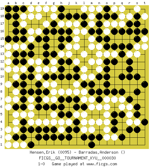 Last move : 1-0 2007 December 20 13:24:53 [Event "FICGS__GO__TOURNAMENT_KYU__000030"] [Site "FICGS"] [Date "2007.04.22"] [Round "1"] [Black "Hensen,Erik"] [White "Barradas,Anderson"] [Result "1-0"] [Rating 1 "0095"] 1.r16 d4 2.d17 d16 3.q5 e16 4.e17 f17 5.f18 c17 6.e3 g18 7.d3 f19 8.p3 e18 9.c4 d18 10.q8 e4 11.q10 c5 12.f3 f4 13.g3 b4 14.c3 b3 15.d10 b5 16.c7 d5 17.h5 g4 18.b2 a2 19.c2 b1 20.k4 c1 21.l9 h4 22.j3 h3 23.h2 j4 24.j5 k5 25.k3 k2 26.j2 l3 27.e7 l4 28.l6 l5 29.l2 k1 30.m2 g1 31.g2 h1 32.m5 m4 33.k6 m6 34.d13 k16 35.n16 m14 36.q13 p11 37.n5 n4 38.n7 m7 39.m8 l7 40.g6 j6 41.k7 k8 42.h15 n12 43.j10 g12 44.j7 n6 45.b6 o5 46.l17 j8 47.h7 p9 48.g10 j14 49.m13 n13 50.p8 p10 51.l12 l13 52.c15 g5 53.h6 m12 54.k13 k12 55.j12 l11 56.o8 o7 57.n8 j13 58.n10 k14 59.c6 d6 60.b16 l1 61.r3 o6 62.p12 q11 63.r11 q9 64.r10 q12 65.o11 p13 66.o12 o13 67.q14 n11 68.o10 r9 69.r12 r8 70.k10 m10 71.g13 h13 72.m9 l10 73.h12 k9 74.r7 p7 75.o9 q7 76.s8 s9 77.s10 h8 78.f15 g8 79.f6 d7 80.d8 f7 81.f8 g7 82.e6 a6 83.c8 j1 84.m1 l8 85.t9 g9 86.h11 g11 87.f12 f11 88.f10 e11 89.f13 f1 90.d1 a3 91.b18 a1 92.e2 f9 93.e8 e1 94.f2 m3 95.o15 k15 96.j18 k17 97.k18 l16 98.m16 m17 99.l18 m18 100.h10 e10 101.e9 o3 102.n2 o2 103.n17 m19 104.r17 m15 105.e15 e12 106.p14 n14 107.c19 d15 108.d14 c18 109.p5 d19 110.b17 b19 111.h14 h17 112.h19 j17 113.h18 g19 114.n18 p19 115.p18 q19 116.g16 n19 117.o18 l19 118.o19 q18 119.a18 e19 120.f16 q17 121.g17 p17 122.h16 o16 123.n15 p15 124.o14 o17 125.a19 d12 126.c12 a7 127.c16 c11 128.b12 b11 129.c10 b10 130.b9 a9 131.c19 q6 132.b19 a12 133.b13 a13 134.j15 a11 135.d11 b8 136.c9 b14 137.c13 b7 138.k11 o4 139.j16 r18 140.s18 r15 141.q16 q15 142.p4 s19 143.s16 t18 144.s17 t15 145.s15 s14 146.r14 a14 147.b15 c14 148.a15 t14 149.t16 s13 150.f14 r13 151.p16 r6 152.s6 r5 153.s5 r4 154.s3 p2 155.q2 s4 156.t4 1-0 Here are the names of the openings (joseki) played in the four corners : Corner d16 : d17 d16 Komoku (Somok, Xiao~mu`) 3-4 Point. The komoku (3-4) point is the traditional corner enclosure move.. Corner d4 : d4 e3 Hoshi (Hwajeom, Seongjeom, Xingwei`) 4-4 Point. The star or hoshi (4-4) point, emphasizing influence at the potential expense of territory. Player Black won this Go (weiqi, baduk) game. Follow this game move after move (download)Don't make empty triangles. (Anonymous) If things go wrong, don't go with them. (Roger Babson)