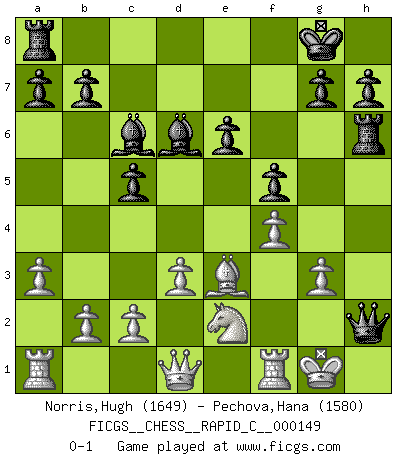 Last move : 0-1 2018 April 30 14:16:53 [Event "FICGS__CHESS__RAPID_C__000149"] [Site "FICGS"] [Date "2018.01.28"] [Round "1"] [White "Norris,Hugh"] [Black "Pechova,Hana"] [Result "0-1"] [WhiteElo "1649"] [BlackElo "1580"] 1.e4 c5 2.Nf3 d6 3.Be2 Nf6 4.e5 dxe5 5.Nxe5 e6 6.O-O Nbd7 7.Bb5 Bd6 8.Bxd7+ Nxd7 9.Nxd7 Bxd7 10.Nc3 O-O 11.d3 f5 12.f4 Bc6 13.a3 Rf6 14.Be3 Rh6 15.Ne2 Qh4 16.g3 Qxh2+ 0-1 Sicilian Kingside Castling by player White (move 6) Kingside Castling by player Black (move 10) Player Black won this chess game. Follow this game move after move (download)Chess problems demand from the composer the same virtues that characterize all worthwhile art: originality, invention, conciseness, harmony, complexity, and splendid insincerity. (Vladimir Nabokov) Jeder weiß, dass Gasprom Putins persönliches Machtinstrument ist. Die Firma wird vom Kreml aus geleitet und wird schon deshalb nie transparent sein. (Garry Kasparov) Mi estilo es algo parecido entre un poco de Tal y Petrosian. (Reshevsky) Ne tendez aucun piège pour le plaisir ! Ne jouez rien dans l'espoir que l'adversaire réagisse de façon stupide ! Prenez toujours pour acquis que l'adversaire va trouver le meilleur coup ! Ne jouez jamais de coup dans l'espoir que l'adversaire ne voie pas la menace ! Chacun de vos coups doit améliorer la position d'une façon ou d'une autre. Whenever people agree with me, I always feel I must be wrong. (Oscar Wilde)