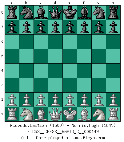Last move : 0-1 2018 February 28 3:44:17 [Event "FICGS__CHESS__RAPID_C__000149"] [Site "FICGS"] [Date "2018.01.28"] [Round "1"] [White "Acevedo,Bastian"] [Black "Norris,Hugh"] [Result "0-1"] [WhiteElo "1500"] [BlackElo "1649"] 0-1 This chess game has been lost on time (started : 2018.01.28 19:41:15) Player Black won this chess game. Follow this game move after move (download)Different people feel differently about resigning. (Bobby Fischer) Wie, soll nun auch die Opposition abgeschafft werden? Ja, es tut mir leid, Ihnen diesen Schmerz nicht ersparen zu können. (Aaron Nimzowitsch) El ganador de una partida es aquel jugador que hace el penúltimo error. (Savielly Tartakover) La solitude du joueur d'Echecs à l'approche du mat est semblable à celle du condamné. (Francis Szpiner) Philosophers use a language that is already deformed as though by shoes that are too tight. (Ludwig Wittgenstein)