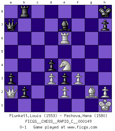 Last move : 0-1 2018 June 26 20:11:15 [Event "FICGS__CHESS__RAPID_C__000149"] [Site "FICGS"] [Date "2018.01.28"] [Round "1"] [White "Plunkett,Louis"] [Black "Pechova,Hana"] [Result "0-1"] [WhiteElo "1553"] [BlackElo "1580"] 1.c4 e5 2.g3 Nf6 3.Bg2 d5 4.cxd5 Nxd5 5.Nc3 Nb6 6.d3 Be7 7.Nf3 Nc6 8.O-O O-O 9.a3 Be6 10.b4 a5 11.b5 Nd4 12.Nxd4 exd4 13.Ne4 a4 14.Bf4 g5 15.Bc1 f5 16.Nd2 Bd5 17.f3 Ra5 18.Rb1 Ba2 19.Ra1 Be6 20.Qe1 Rxb5 21.Rb1 Rxb1 22.Nxb1 f4 23.Nd2 Nd5 24.Ne4 c5 25.Kh1 b5 26.gxf4 gxf4 27.Qf2 Kh8 28.Rg1 Ne3 29.Bxe3 fxe3 30.Qg3 Qb8 31.Qe1 b4 32.axb4 cxb4 33.Qa1 Qa7 34.Rc1 b3 35.Rc6 a3 36.Rxe6 b2 37.Qa2 Rb8 0-1 English Opening Kingside Castling by player White (move 8) Kingside Castling by player Black (move 8) Player Black won this chess game. Follow this game move after move (download)When I asked Fischer why he had not played a certain move in our game, he replied: 'Well, you laughed when I wrote it down !' (Mikhail Tal) Alles was ich jemals tun will ist Schach spielen. (Robert James Fischer) Te sientas frente a un tablero y repentinamente tu corazón brinca. Tu mano tiembla al tomar una pieza y moverla. Pero lo que el Ajedrez te enseña es que tu debes permanecer ahí con calma y pensar de que si realmente es una buena idea o de que si hay otras ideas mejores. (Stanley Kubrick) L'action d'une oeuvre littéraire se déroule sur un champ de bataille. Les masques et les types du drame moderne correspondent aux pièces du jeu d'échecs. L'intrigue correspond aux coups et aux gambits, c'est à dire aux techniques du jeu telles qu'utilisées et interprétées par les joueurs. Les tactiques et les péripéties [mouvements] correspondent aux coups exécutés par l'adversaire. (Viktor Shklovsky) When you stop learning you start dying. (M. Scott Adams)