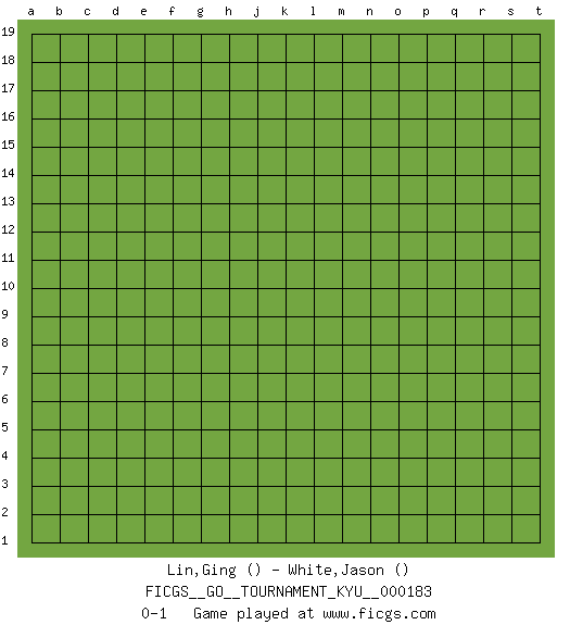 Last move : 0-1 2018 February 28 15:45:25 [Event "FICGS__GO__TOURNAMENT_KYU__000183"] [Site "FICGS"] [Date "2018.01.29"] [Round "1"] [Black "Lin,Ging"] [White "White,Jason"] [Result "0-1"] 0-1 This go game has been lost on time (started : 2018.01.29 14:54:44) Here are the names of the openings (joseki) played in the four corners : Player White won this Go (weiqi, baduk) game. Follow this game move after move (download)With only one group, you will win. (Anonymous) A good teacher is like a candle - it consumes itself to light the way for others. (Author unknown)