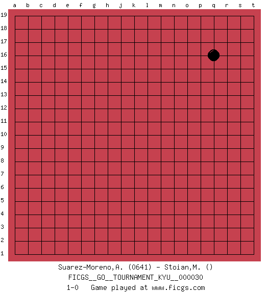 Last move : 1-0 2007 April 23 10:53:46 [Event "FICGS__GO__TOURNAMENT_KYU__000030"] [Site "FICGS"] [Date "2007.04.22"] [Round "1"] [Black "Suarez-Moreno,Alejandro"] [White "Stoian,Mihail"] [Result "1-0"] [Rating 1 "0641"] 1.q16 1-0 Here are the names of the openings (joseki) played in the four corners : Player Black won this Go (weiqi, baduk) game. Follow this game move after move (download)The nature of a game comes from what is played, but it's the sensitivity to the possible and the impossible that gives it value. (Pierre Audouard) There is a very easy way to return from a casino with a small fortune : go there with a large one. (Jack Yelton)