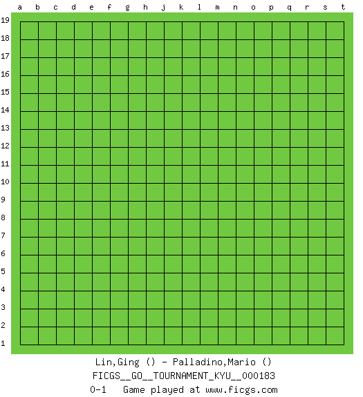 Last move : 0-1 2018 February 28 15:45:25 [Event "FICGS__GO__TOURNAMENT_KYU__000183"] [Site "FICGS"] [Date "2018.01.29"] [Round "1"] [Black "Lin,Ging"] [White "Palladino,Mario"] [Result "0-1"] 0-1 This go game has been lost on time (started : 2018.01.29 14:54:44) Here are the names of the openings (joseki) played in the four corners : Player White won this Go (weiqi, baduk) game. Follow this game move after move (download)You have to like to win, and to learn to recognize the errors that gave you the victory. (Pierre Audouard) The difference between perseverance and obstinacy is that one comes from a strong will, and the other from a strong won't. (Henry Ward Beecher)