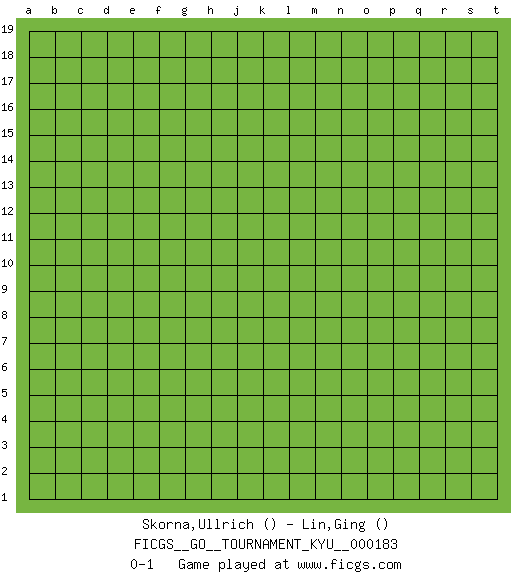 Last move : 0-1 2018 February 28 15:45:25 [Event "FICGS__GO__TOURNAMENT_KYU__000183"] [Site "FICGS"] [Date "2018.01.29"] [Round "1"] [Black "Skorna,Ullrich"] [White "Lin,Ging"] [Result "0-1"] 0-1 This go game has been lost on time (started : 2018.01.29 14:54:44) Here are the names of the openings (joseki) played in the four corners : Player White won this Go (weiqi, baduk) game. Follow this game move after move (download)You don't have to be really good anymore to get good results. What's happening with chess is that it's gradually losing its place as the par excellence of intellectual activity. Smart people in search of a challenging board game might try a game called Go. (Hans Berliner, The New York Times, 2003) The large trees attract high winds. (Chinese proverb)
