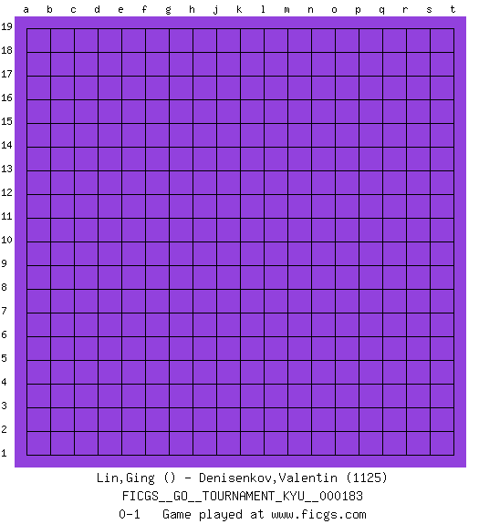 Last move : 0-1 2018 February 28 15:45:25 [Event "FICGS__GO__TOURNAMENT_KYU__000183"] [Site "FICGS"] [Date "2018.01.29"] [Round "1"] [Black "Lin,Ging"] [White "Denisenkov,Valentin"] [Result "0-1"] [Rating 2 "1125"] 0-1 This go game has been lost on time (started : 2018.01.29 14:54:44) Here are the names of the openings (joseki) played in the four corners : Player White won this Go (weiqi, baduk) game. Follow this game move after move (download)The L-group is dead. (Anonymous) Train yourself to let go of everything you fear to lose. (Master Yoda in Star Wars ep.3)