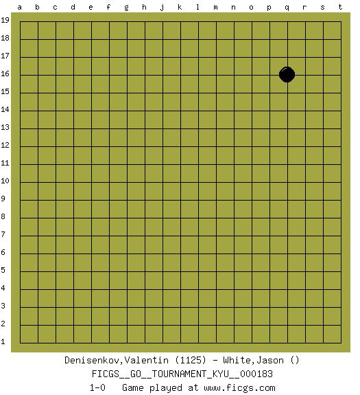 Last move : 1-0 2018 February 28 15:45:25 [Event "FICGS__GO__TOURNAMENT_KYU__000183"] [Site "FICGS"] [Date "2018.01.29"] [Round "1"] [Black "Denisenkov,Valentin"] [White "White,Jason"] [Result "1-0"] [Rating 1 "1125"] 1.q16 1-0 This go game has been lost on time (started : 2018.01.29 14:54:44) Here are the names of the openings (joseki) played in the four corners : Player Black won this Go (weiqi, baduk) game. Follow this game move after move (download)You have to like to win, and to learn to recognize the errors that gave you the victory. (Pierre Audouard) It's only after you lost everything, Tyler says, that you're free to do anything. (Chuck Palahniuk, Fight Club)