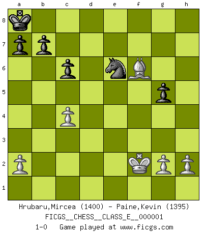 Last move : 1-0 2006 July 14 20:20:20 [Event "FICGS__CHESS__CLASS_E__000001"] [Site "FICGS"] [Date "2006.04.10"] [Round "1"] [White "Hrubaru,Mircea"] [Black "Paine,Kevin"] [Result "1-0"] [WhiteElo "1400"] [BlackElo "1395"] 1.e4 e5 2.f4 Bc5 3.Nf3 d6 4.c3 Nf6 5.d4 exd4 6.cxd4 Bb6 7.e5 dxe5 8.fxe5 Nd5 9.Nc3 Be6 10.Bb5+ c6 11.Ba4 Nd7 12.Bg5 f6 13.exf6 N7xf6 14.Qe2 Qe7 15.O-O Nc7 16.Bc2 O-O-O 17.Rad1 h6 18.Bf4 g5 19.Be5 Rhf8 20.Na4 Nfd5 21.Nxb6+ Nxb6 22.Nd2 Bd5 23.Bf5+ Kb8 24.b3 Ka8 25.Nc4 Nd7 26.Bxd7 Qxd7 27.Rxf8 Rxf8 28.Rf1 Rxf1+ 29.Qxf1 Ne6 30.Qf6 Qd8 31.Qxh6 Bxc4 32.bxc4 Nxd4 33.Qf6 Qxf6 34.Bxf6 Ne6 35.Kf2 1-0 KGD : Classical, 4.c3 Kingside Castling by player White (move 15) Queenside Castling by player Black (move 16) Player White won this chess game. Follow this game move after move (download)Modern Chess is too much concerned with things like Pawn structure. Forget it, Checkmate ends the game. (Nigel Short) Immer nach dem besten Zug zu suchen ist ziemlich unpraktisch. (Nigel Short) Si yo gano un torneo, yo lo gano por mí mismo. Yo hago las jugadas. Nadie me ayuda. (Bobby Fischer) Donnez-moi un Cavalier en 6e et je gagnerais toutes mes parties. (Steinitz) Man is reluctant to give credit for intelligence to anyone, except his enemies. (Albert Einstein)