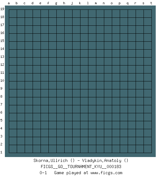 Last move : 0-1 2018 February 28 15:45:25 [Event "FICGS__GO__TOURNAMENT_KYU__000183"] [Site "FICGS"] [Date "2018.01.29"] [Round "1"] [Black "Skorna,Ullrich"] [White "Vladykin,Anatoly"] [Result "0-1"] 0-1 This go game has been lost on time (started : 2018.01.29 14:54:44) Here are the names of the openings (joseki) played in the four corners : Player White won this Go (weiqi, baduk) game. Follow this game move after move (download)Five groups might live but the six will die. (Anonymous) You can only get smarter by playing a smarter opponent. (Revolver, movie)