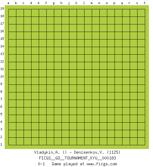 Last move : 0-1 2018 February 28 15:45:25 [Event "FICGS__GO__TOURNAMENT_KYU__000183"] [Site "FICGS"] [Date "2018.01.29"] [Round "1"] [Black "Vladykin,Anatoly"] [White "Denisenkov,Valentin"] [Result "0-1"] [Rating 2 "1125"] 0-1 This go game has been lost on time (started : 2018.01.29 14:54:44) Here are the names of the openings (joseki) played in the four corners : Player White won this Go (weiqi, baduk) game. Follow this game move after move (download)Capture what you cut off. (Anonymous) God, you are such an idiot. - Actually, I thought I was more of a jerk. (Gregory House to Stacy Warner, House M.D.)