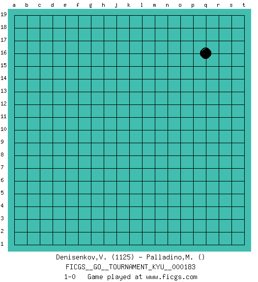 Last move : 1-0 2018 January 29 15:45:20 [Event "FICGS__GO__TOURNAMENT_KYU__000183"] [Site "FICGS"] [Date "2018.01.29"] [Round "1"] [Black "Denisenkov,Valentin"] [White "Palladino,Mario"] [Result "1-0"] [Rating 1 "1125"] 1.q16 1-0 Here are the names of the openings (joseki) played in the four corners : Player Black won this Go (weiqi, baduk) game. Follow this game move after move (download)Very few good moves are played. (Pierre Audouard) What doesn't kill us makes us stronger. (Friedrich Nietzsche)