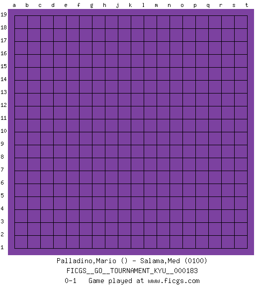 Last move : 0-1 2018 January 29 15:45:39 [Event "FICGS__GO__TOURNAMENT_KYU__000183"] [Site "FICGS"] [Date "2018.01.29"] [Round "1"] [Black "Palladino,Mario"] [White "Salama,Med"] [Result "0-1"] [Rating 2 "0100"] 0-1 Here are the names of the openings (joseki) played in the four corners : Player White won this Go (weiqi, baduk) game. Follow this game move after move (download)If a formation is symmetrical, play at the center. (Anonymous) All maxims have their antagonist maxims; proverbs should be sold in pairs, a single one being but a half truth. (William Mathews)