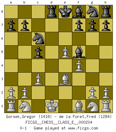 Last move : 0-1 2018 March 19 5:55:12 [Event "FICGS__CHESS__CLASS_E__000204"] [Site "FICGS"] [Date "2018.01.30"] [Round "1"] [White "Gorsek,Gregor"] [Black "de la Foret,Fred"] [Result "0-1"] [WhiteElo "1418"] [BlackElo "1284"] 1.e4 c5 2.c3 d5 3.exd5 Qxd5 4.d4 e5 5.dxe5 Qxd1+ 6.Kxd1 Nc6 7.f4 Bf5 8.Be3 Rd8+ 0-1 This chess game has been lost on time (started : 2018.01.30 21:45:48) Sicilian : Alapin's variation (2.c3) Player Black won this chess game. Follow this game move after move (download)Chess is the art of analysis. (Mikhail Botvinnik) Ein Buch ist ein Spiegel; wenn ein Affe hineinsieht, so kann kein Apostel heraus gucken. (Georg Christoph Lichtenberg) Hay jugadores fuertes y personas amables y yo soy un jugador fuerte. (Bobby Fischer) La guerre est enfant de la passion, la passion est enfant du narcissisme et le narcissisme est l'enfant. (...) Une autre partie ? (Thibault de Vassal) Perception is reality. (Immanuel Kant)