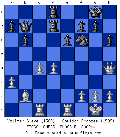 Last move : 1-0 2018 May 5 22:38:2 [Event "FICGS__CHESS__CLASS_E__000204"] [Site "FICGS"] [Date "2018.01.30"] [Round "1"] [White "Vollmer,Steve"] [Black "Gouldar,Frances"] [Result "1-0"] [WhiteElo "1568"] [BlackElo "1599"] 1.d4 d5 2.c4 e6 3.Nc3 Nf6 4.Nf3 Bb4 5.a3 Bxc3+ 6.bxc3 O-O 7.e3 Re8 8.Bd3 dxc4 9.Bxc4 b6 10.O-O Ba6 11.Bxa6 Nxa6 12.Qa4 Qc8 13.Bb2 c5 14.Ne5 Qb7 15.c4 cxd4 16.exd4 Rad8 17.Rac1 Nd7 18.Nxd7 Rxd7 19.Rfd1 Red8 20.Qb5 Nc7 21.Qg5 h6 22.Qg4 Ne8 23.Re1 Nf6 24.Qh4 1-0 Comment by player 2 : Frances Gouldar : Hello and good game ! QGD : Ragozin variation Kingside Castling by player Black (move 6) Kingside Castling by player White (move 10) Player White won this chess game. Follow this game move after move (download)Nonsense was the last thing Fischer was interested in, as far as Chess was concerned. (Elie Agur) Wenn sie aufgeben, dann danke ich Ihnen für das Spiel (Eventualzug beim Fernschach). (Anonymous) Debemos de asegurarnos de que el Ajedrez no se convierta en un lenguaje muerto, muy interesante, pero tan solo para un grupo muy pequeño. (Sytze Faber) Vouloir jouer aux échecs contre soi-même est aussi paradoxal que vouloir marcher sur son ombre. (Stefan Zweig) Be who you are, and say what you feel because those who mind don't matter, and those who matter don't mind. (Dr Seuss)