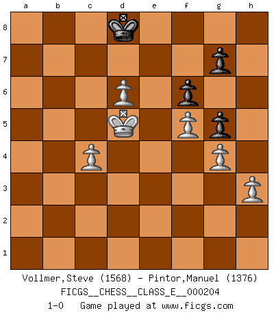 Last move : 1-0 2018 February 16 19:29:21 [Event "FICGS__CHESS__CLASS_E__000204"] [Site "FICGS"] [Date "2018.01.30"] [Round "1"] [White "Vollmer,Steve"] [Black "Pintor,Manuel"] [Result "1-0"] [WhiteElo "1568"] [BlackElo "1376"] 1.d4 d5 2.c4 c6 3.Nc3 Nf6 4.Nf3 Bf5 5.cxd5 Nxd5 6.g3 Nd7 7.Bg2 e6 8.O-O Be7 9.Re1 O-O 10.e4 Nxc3 11.bxc3 Bg4 12.Qb3 Rb8 13.h3 Bh5 14.Bb2 Bg6 15.a4 Nf6 16.Ne5 Qb6 17.Qxb6 axb6 18.Nxg6 hxg6 19.g4 Nh7 20.Bc1 Ra8 21.Be3 b5 22.axb5 cxb5 23.Rab1 Ra5 24.f4 Rc8 25.Rb3 Rc4 26.Bf1 Rca4 27.Rxb5 Rxb5 28.Bxb5 Ra3 29.Bd2 Ra2 30.Rd1 Nf6 31.Bd3 Rb2 32.Kf2 Nd7 33.Ke3 b5 34.Rb1 Rxb1 35.Bxb1 Nb6 36.Bd3 Nc4+ 37.Bxc4 bxc4 38.d5 g5 39.f5 exd5 40.exd5 Bc5+ 41.Ke4 f6 42.Be3 Bxe3 43.Kxe3 Kf7 44.Kd4 Ke7 45.Kxc4 Kd6 46.Kd4 Kc7 47.Kc5 Kd7 48.c4 Kc7 49.d6+ Kd8 50.Kd5 1-0 QGD Slav defense Kingside Castling by player White (move 8) Kingside Castling by player Black (move 9) 10 pieces endgame at move 45 : White KPPPPP , Black KPPP WHITE : King + 5 Pawns BLACK : King + 3 Pawns Player White won this chess game. Follow this game move after move (download)It is not a move, even the best move that you must seek, but a realizable plan. (Eugene Znosko-Borovsky) Dass jemand wie Surab Asmaiparaschwili, der selbst Elopunkte gekauft hat , Vize-Präsident der Fide werden konnte, sagt schon einges über den Zustand dieser Organisation aus. (Joel Lautier) Una buena memoria, concentración, imaginación y una fuerte voluntad, se requiere para llegar a ser un buen jugador. (Bobby Fischer) Aucun coup ne doit être joué sans but. (Pedro Damiano) There are three kinds of lies: lies, damned lies and statistics. (Mark Twain)