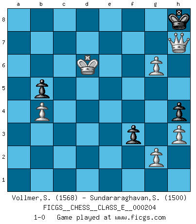 Last move : 1-0 2018 February 5 13:15:12 [Event "FICGS__CHESS__CLASS_E__000204"] [Site "FICGS"] [Date "2018.01.30"] [Round "1"] [White "Vollmer,Steve"] [Black "Sundararaghavan,Shailesh"] [Result "1-0"] [WhiteElo "1568"] [BlackElo "1500"] 1.e4 e5 2.Nf3 Nc6 3.Bb5 Bc5 4.O-O Nge7 5.c3 O-O 6.d4 exd4 7.cxd4 Bb6 8.d5 Nb8 9.Nc3 c6 10.Bc4 cxd5 11.exd5 d6 12.h3 h6 13.Bd3 Bf5 14.Bf4 Bxd3 15.Qxd3 Ng6 16.Bh2 Na6 17.Rac1 Rc8 18.Qf5 Nb4 19.Rfd1 Re8 20.a3 Na6 21.b4 Rc7 22.Bg3 Qc8 23.Qxc8 Rexc8 24.Ne2 Rxc1 25.Rxc1 Rd8 26.Nc3 h5 27.Kf1 f5 28.Bh4 Nxh4 29.Nxh4 Rf8 30.Ng6 Rf7 31.Nf4 h4 32.Nb5 Rf6 33.Rc8+ Kh7 34.Ne6 g6 35.Nxd6 Nc7 36.Rxc7+ Bxc7 37.Ne8 Rxe6 38.dxe6 Bd8 39.Nc7 Kg7 40.Nd5 Kf8 41.Ke2 Bg5 42.Kd3 b5 43.f4 Bd8 44.Kd4 a6 45.Ke5 Ke8 46.Kd6 a5 47.e7 axb4 48.axb4 g5 49.Nf6+ Kf7 50.e8Q+ Kxf6 51.Qxd8+ Kf7 52.fxg5 f4 53.Qf6+ Kg8 54.g6 f3 55.Qf7+ Kh8 56.Qh7+ 1-0 Ruy Lopez : Classical (Cordel) defense Kingside Castling by player White (move 4) Kingside Castling by player Black (move 5) Promotion Queen by player White (move 50) 10 pieces endgame at move 52 : White KQPPPP , Black KPPP WHITE : King + 1 Queen 4 Pawns BLACK : King + 3 Pawns Player White won this chess game. Follow this game move after move (download)Daring ideas are like Chess men moved forward. They may be beaten, but they may start a winning game. (Johann Wolfgang von Goethe) Schon mancher Spieler hat aufgegeben, um zu vermeiden, daß er eine Figur verliert. (Savielly Grigorievitsch Tartakower) Tu puedes aprender mucho mas de una partida que pierdas que de una partida ganada. Tendras que perder cientos de partidas antes de llegar a ser un buen jugador. (Jose Raul Capablanca) La conception d'un plan est le processus par lequel un joueur exploite les avantages de sa position tout en s'efforçant d'en réduire au minimum les inconvénients. Afin de garantir le succès, un plan doit toujours se fonder sur un diagnostic objectif des particularités d'une position. La conception d'un plan est d'autant plus difficile que la position est équilibrée, et grandement facilitée lorsqu'il n'existe qu'un seul plan susceptible de répondre aux exigences de la position. (Harry Golombek) I don't diet. I just don't eat as much as I'd like to. (Linda Evangelista, supermodel)