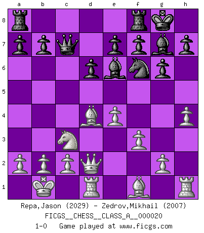 Last move : 1-0 2007 July 31 13:35:0 [Event "FICGS__CHESS__CLASS_A__000020"] [Site "FICGS"] [Date "2007.04.23"] [Round "1"] [White "Repa,Jason"] [Black "Zedrov,Mikhail"] [Result "1-0"] [WhiteElo "2029"] [BlackElo "2007"] 1.e4 c5 2.Nf3 d6 3.d4 cxd4 4.Nxd4 Nf6 5.Nc3 g6 6.Be3 Bg7 7.f3 Nc6 8.Qd2 O-O 9.O-O-O Nxd4 10.Bxd4 Be6 11.Kb1 Qc7 12.h4 1-0 This chess game has been lost on time (started : 2007.04.23 11:59:7) Sicilian : Dragon, Yugoslav attack Kingside Castling by player Black (move 8) Queenside Castling by player White (move 9) Player White won this chess game. Follow this game move after move (download)The chessboard is the world, the pieces are the phenomena of the Universe, the rules of the game are what we call the laws of Nature and the player on the other side is hidden from us. (Thomas Huxley) Der Umstand, daß uns eine 7 Stunden Zeitkontrolle ermöglicht eine großartige, tiefe Partie zu spielen, ist für die Massenmedien nicht weiter von Bedeutung. (Alexej Shirov) Prefiero perder una partida realmente buena, que ganar una mala. (David Levy) Le jeu d'échecs est comme rejeté hors du temps. (Antoine de Saint-Exupéry) All war is based on deception. (Sun Tzu)