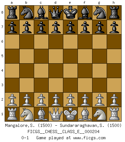 Last move : 0-1 2018 March 12 5:4:19 [Event "FICGS__CHESS__CLASS_E__000204"] [Site "FICGS"] [Date "2018.01.30"] [Round "1"] [White "Mangalore,Sukumar"] [Black "Sundararaghavan,Shailesh"] [Result "0-1"] [WhiteElo "1500"] [BlackElo "1500"] 0-1 This chess game has been lost on time (started : 2018.01.30 21:45:48) Player Black won this chess game. Follow this game move after move (download)In the perfect Chess combination as in a first-rate short story, the whole plot and counter-plot should lead up to a striking finale, the interest not being allayed until the very last moment. (Yates and Winter) Die FIDE ist dabei in die Hände der russischen Mafia zu fallen. (Larry Evans) El Ajedrez es un terrible juego. Si no controlas el centro, tu oponente tiene una posición mas holgada. Si tienes control del centro, ¡entonces realmente tu tienes algo de que preocuparte!. (Siegbert Tarrasch) Un journaliste : 'Vous préférez avoir une dame de plus sur l'échiquier ou au lit ?' Boris Spassky : 'Ca dépend de la position.' There are two types of people in this world, good and bad. The good sleep better, but the bad seem to enjoy the waking hours much more. (Woody Allen)