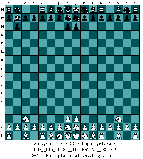 Last move : 0-1 2018 March 6 16:39:20 [Event "FICGS__BIG_CHESS__TOURNAMENT__000109"] [Site "FICGS"] [Date "2018.02.01"] [Round "1"] [White "Puzanov,Vasyl"] [Black "Capung,Albab"] [Result "0-1"] [WhiteElo "1255"] [BlackElo ""] 1.b1-c3 b15-b14 2.p1-o3 c16-b15 0-1 This big chess game has been lost on time (started : 2018.02.01 17:1:46) Follow this game move after move (download)I don't believe in psychology. I believe in good moves. (Bobby Fischer) Ich suche im Schach immer etwas Eigenes. Riskantes Spiel im Stile schachlicher Musketiere ist nicht meine Sache, auch wenn es vielen Freunden scharfer Wendungen gefällt. (Anatoly Karpov) Coloca el contenido de las piezas del Ajedrez en un sombrero, agitalo vigorosamente, arrojalas en un tablero desde una altura de 30 centimetros y así obtendras el estilo de Steinitz. (H. E. Bird) Donnez-moi un Cavalier en 6e et je gagnerais toutes mes parties. (Steinitz) Any activity becomes creative when the doer cares about doing it right or doing it better. (John Updike)
